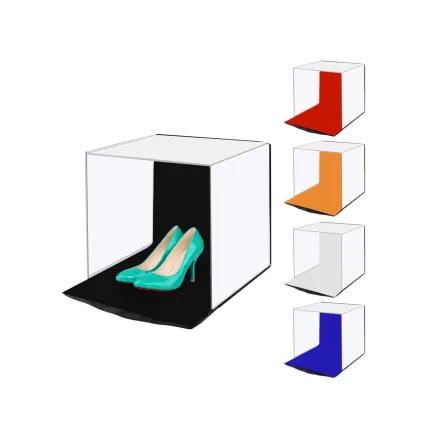 Puluz bešešė palapinė 23 cm LED PU5023Ideali mažų objektų fotografijoms su 6 keičiamais fonais.64 LED šviesos diodaiReguliuojamas ryškumasUSB maitinimas
