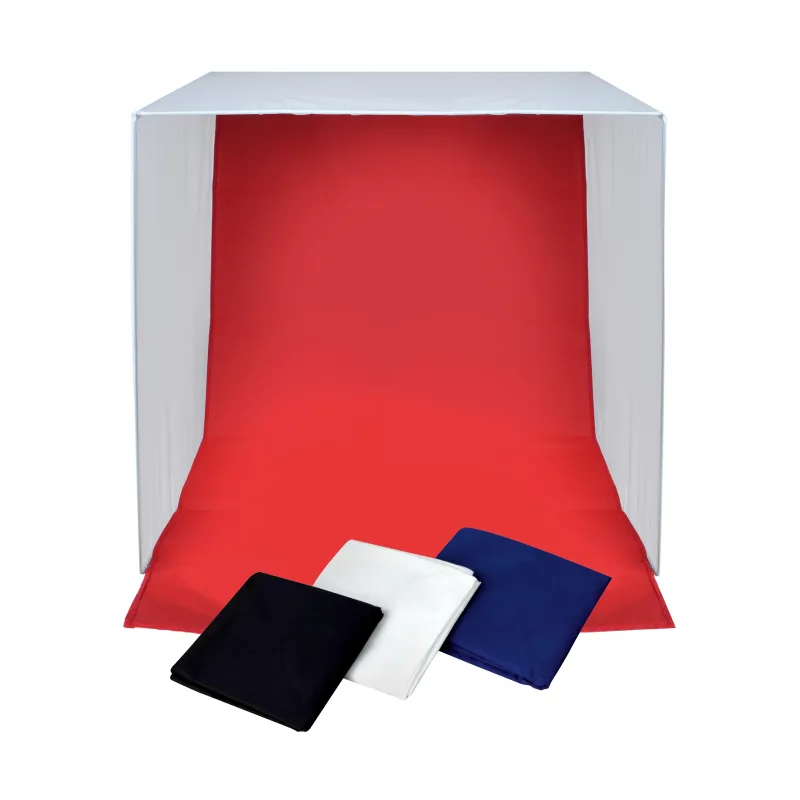 The BRESSER BR-2118B Product Shooting Set 60 x 60 x 60 cm consists of a foldable photo light box with diffuse, milk-white sides that reduce strong shadows when shooting products. Whether on location or in the home studio , with little space for lots of photo studio equipment, the Bresser Mini Photo Studio Set includes everything you need to get started straight away. The shooting box can be easily folded and stowed away. Ideal for on the go. The set includes four fabric backgrounds (120 cm x 60 cm) in the colours white, black, blue and red , which can be easily attached to the box with Velcro. The products can be illuminated with the two 50W halogen lamps including table tripod and practical tilting head. A stable tripod with a maximum height of 28 cm is included for mounting the camera or other accessories.