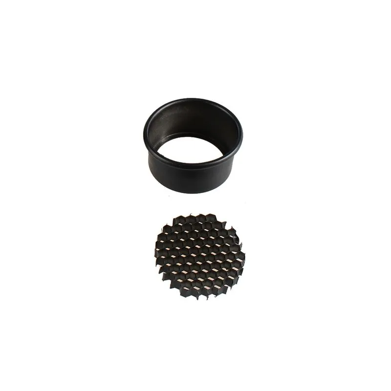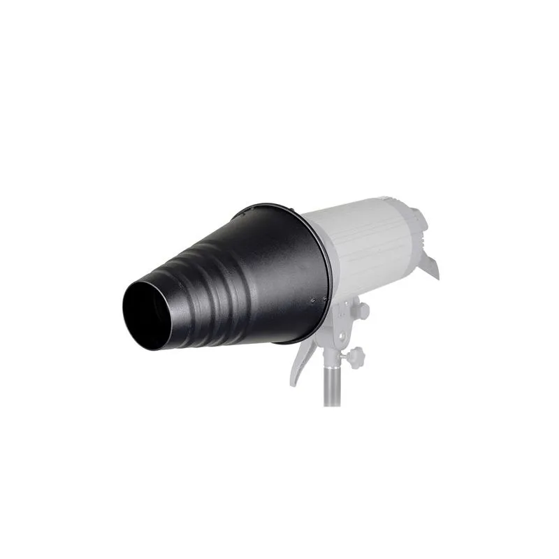 The SK-CS25 from StudioKing is a conical snoot that allows you to focus light in a narrow beam, for example to create a hair light or backlight. The snoot comes with a honeycomb, five color filters and is suitable for both 152mm and 144mm adapter rings (see optional accessories).