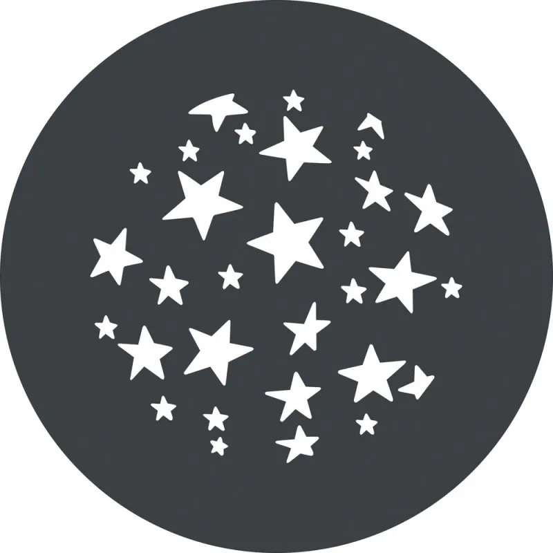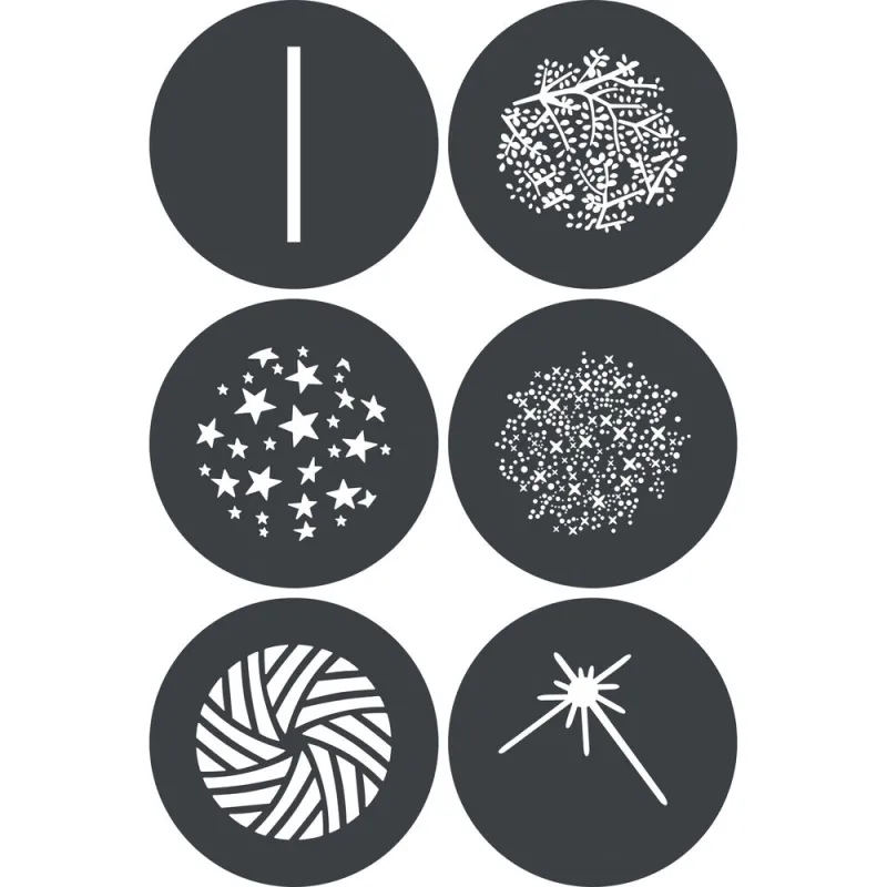 The gobos have 6 different patterns that can be placed in front of the spotlight to project specific shapes, patterns or textures. ,