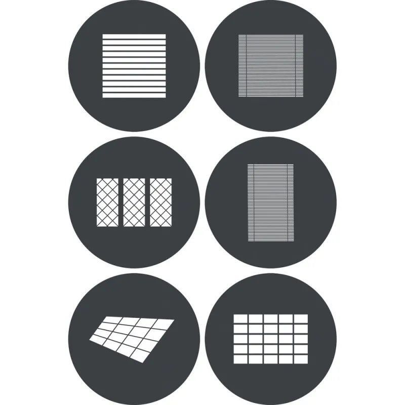 The gobos have 6 different patterns that can be placed in front of the spotlight to project specific shapes, patterns or textures.,