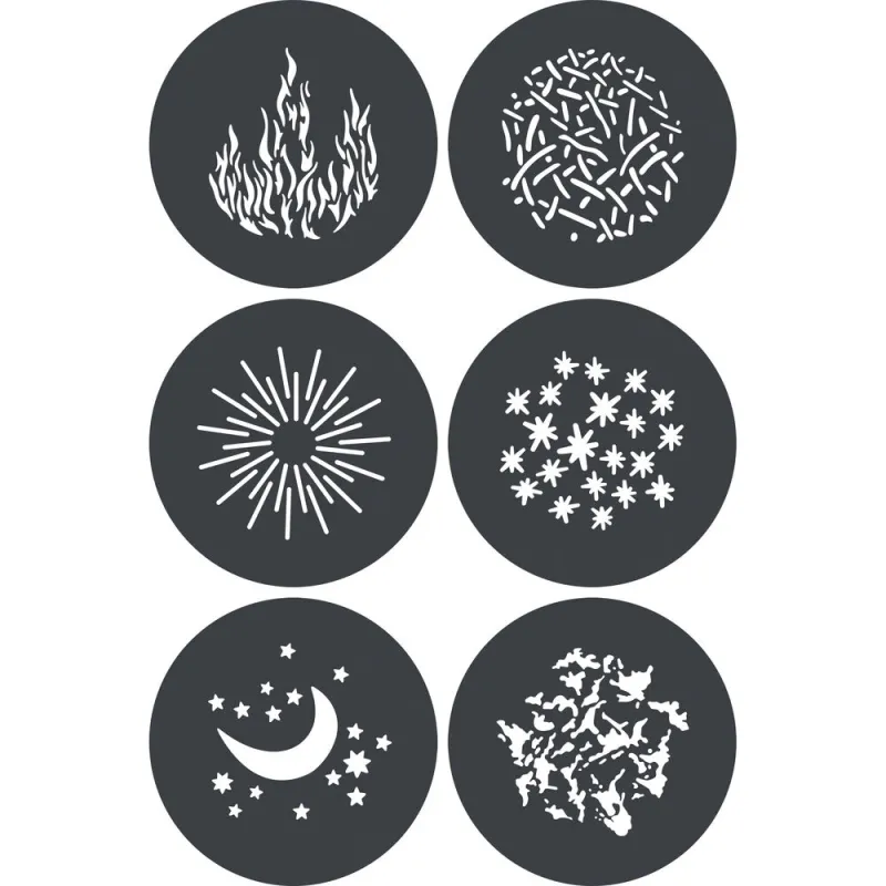 The gobos have 6 different patterns that can be placed in front of the spotlight to project specific shapes, patterns or textures. ,