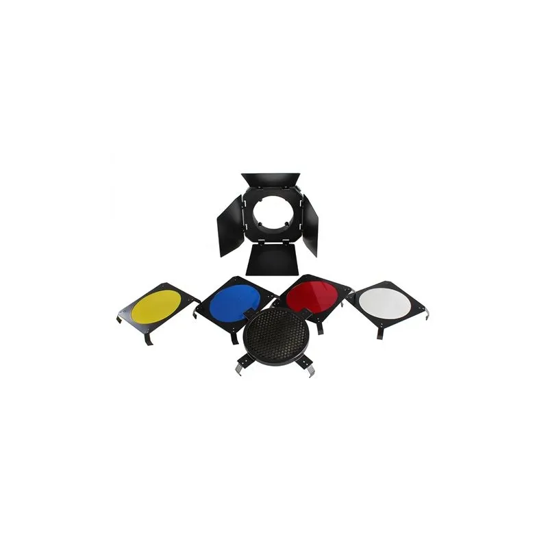 The StudioKing SK-BD95 is a barndoor set suitable for studio flash units with a 9.5 cm diameter, such as the Falcon Eyes SS series and Linkstar MT series. This set consists of four movable flaps, a honeycomb and four color filters in yellow, red, green and blue.