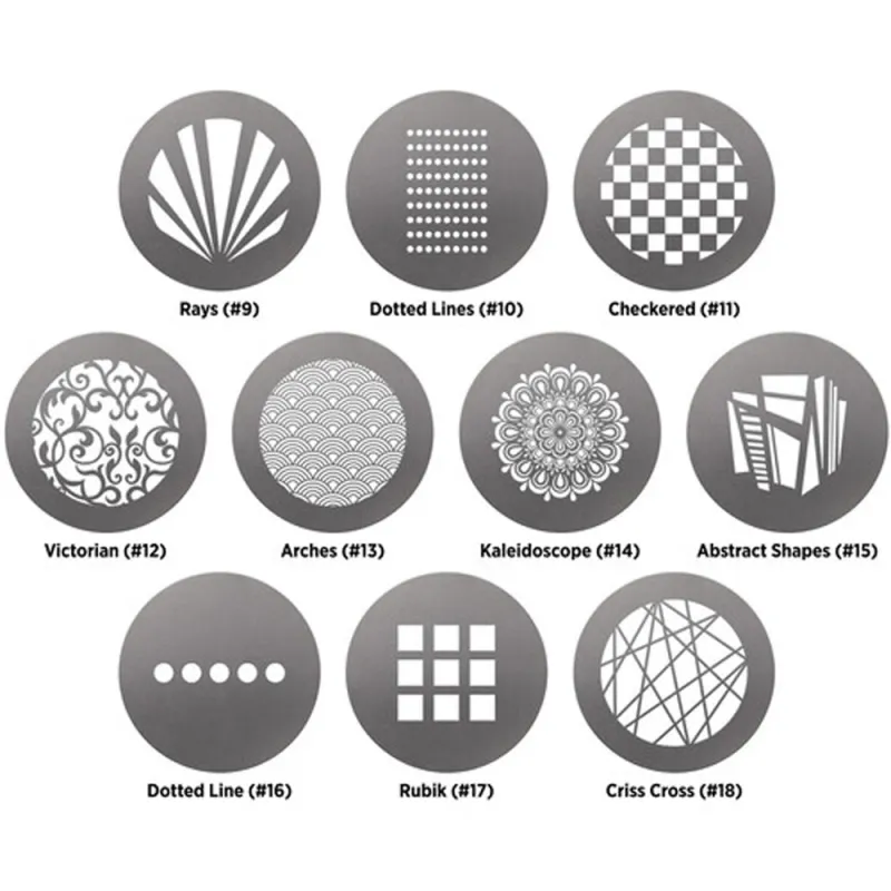 Gobo Pack with 10 pattern gobos for the Optical Spot designed by Lindsay Adler.