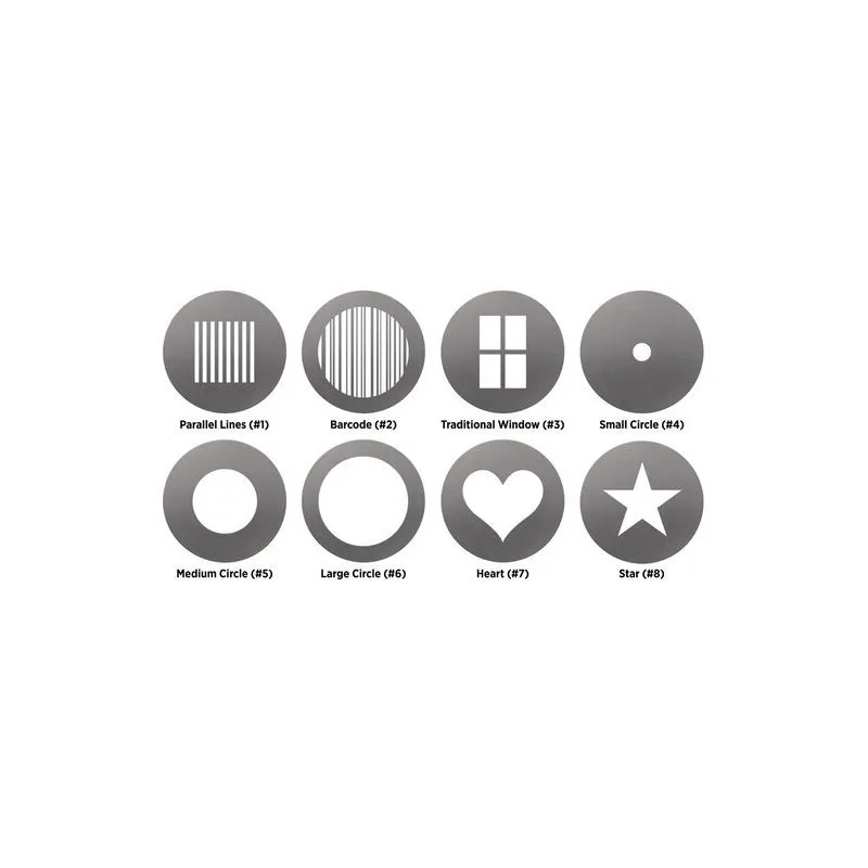 There are 5 gel filters with gel clip for adding color and 8 gobo designs for project a focusable image or pattern of light. It attaches to a compatible light source using the included light mount