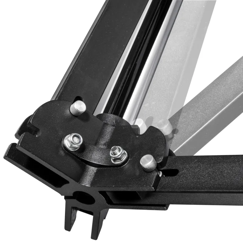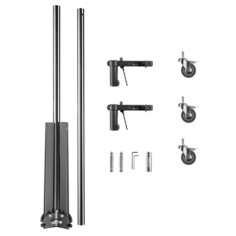 The most important feature of this system is the various application possibilties. By putting two softboxes upon the other, you can quickly make a Striplight, for example. Through the sturdy and smooth-running rubber wheels, the Wheeled Tripod is flexible in use and very suitable for the studio. The lamp handles guarantee a load capacity of approx. 12kg. Thanks to the quick handle, it is easy to adjust in height. The clamp holder has a 5/8 spigot inch connection.