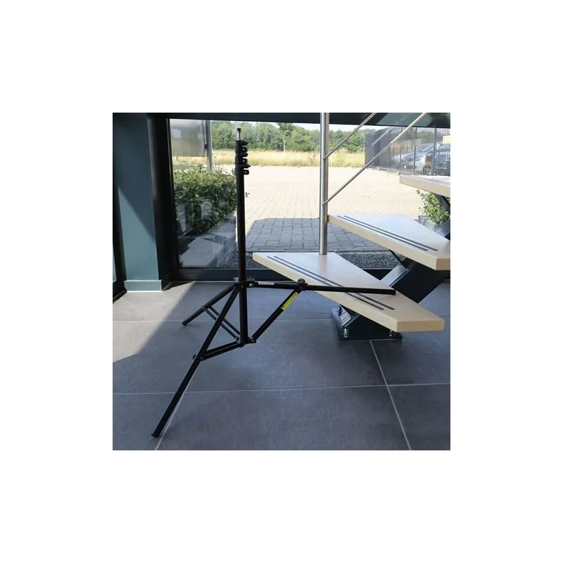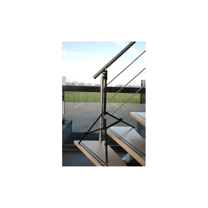 The Falcon Eyes L-2440A/B Light Stand with Adjustable Legs is an all-purpose, lightweight yet sturdy, light stand. The top of the L-2440A/B is equipped with 3 adjustable sections and a spigot, on which a studio flash unit can be mounted. Due to the adjustable legs, the L-2440A/B can be place on almost any even or uneven surface, such as a staircase (see photo 4).