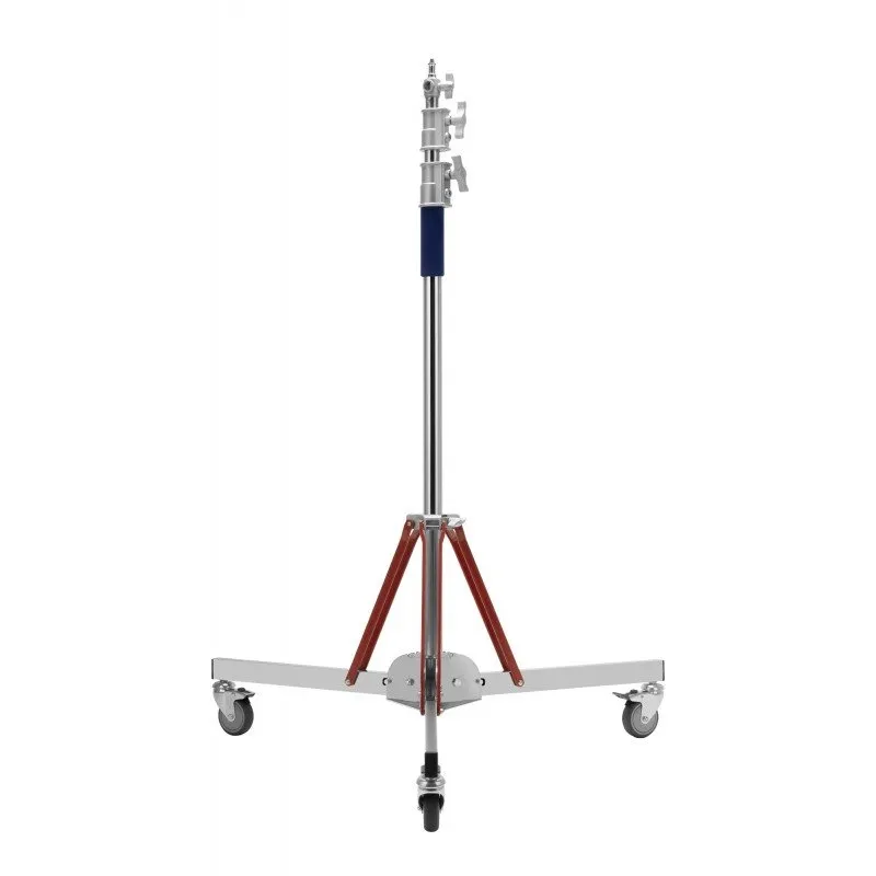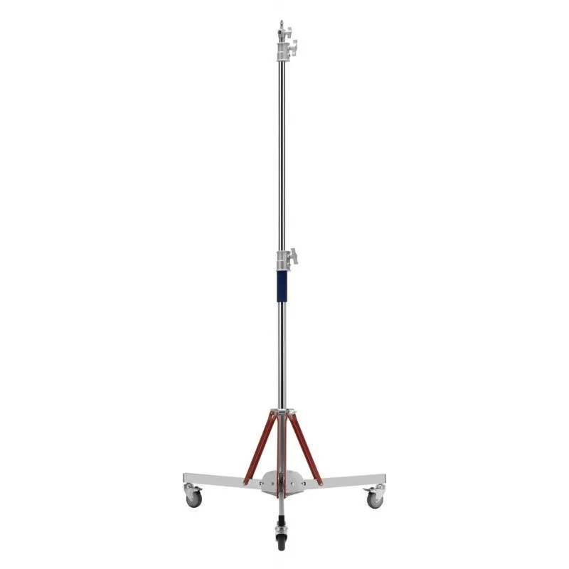 Equipped with practical casters, the tripod facilitates movement on set, allowing for quick adjustments to lighting conditions. The casters ensure mobility and quick response during productions.