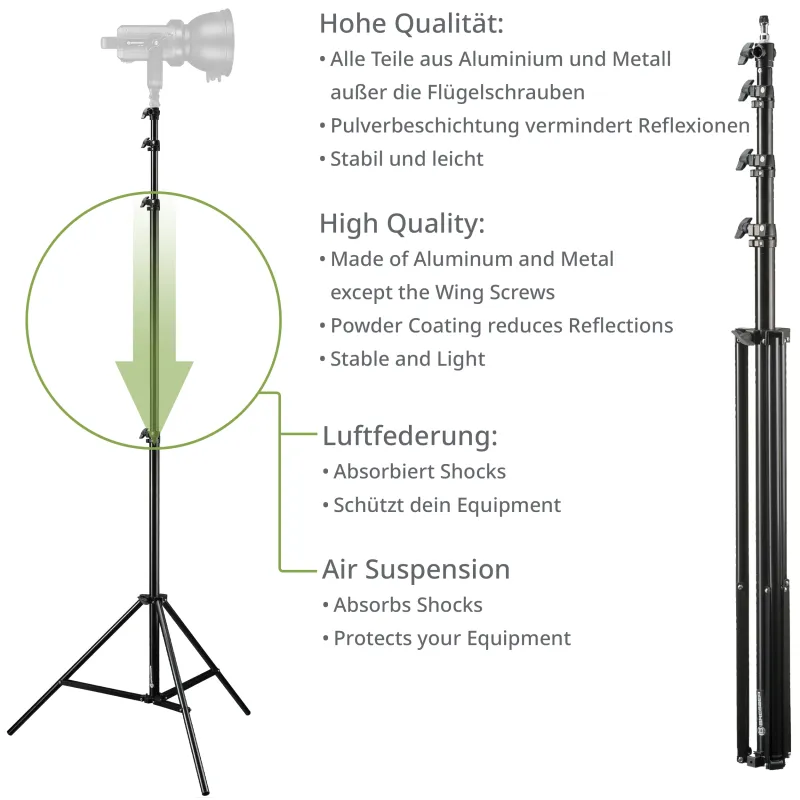 A strong and stable aluminium light stand which can be folded easily to compact dimensions. There is an air suspension system in the tripod , which can stabilize any vibration caused by lowering the flash head. To prevent any reflection the aluminium is provided with a black powder coating .