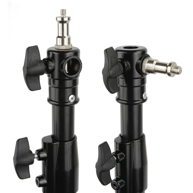 Compact aluminium photo studio light stand Aluminium lightstand with pneumatic shock absorption Black powder coating to prevent reflections Height adjustable: 80,5 - 240 cm Height (folded): 71,5 cm / weight: 1.4 kg Incl.: Tripod, Spigot Adapter