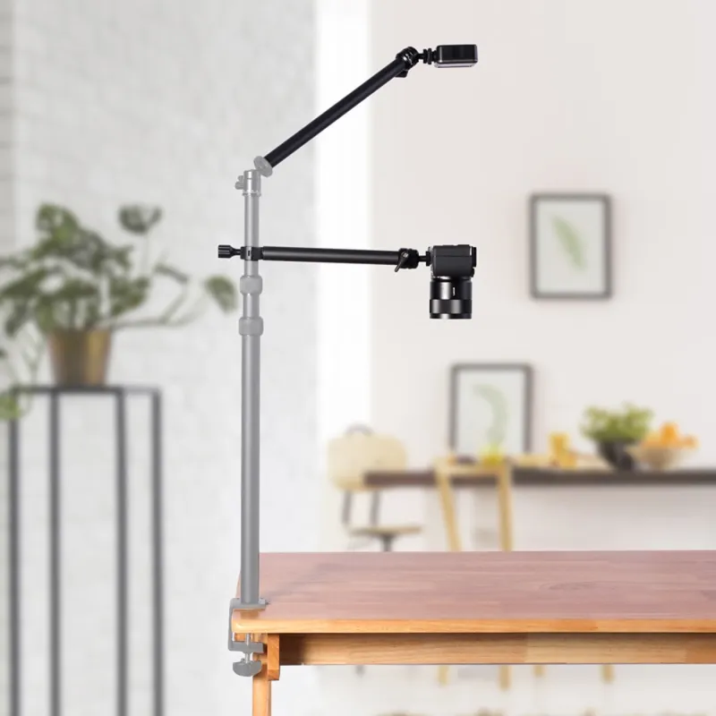 Swivel and tiltable ball heads: Both parts of the arm have a 360 rotatable and 120 tilting ball head with a universal 1/4 screw. On these ball heads, you can mount a camera or an accessory such as a lamp, microphone, smartphone, etc.