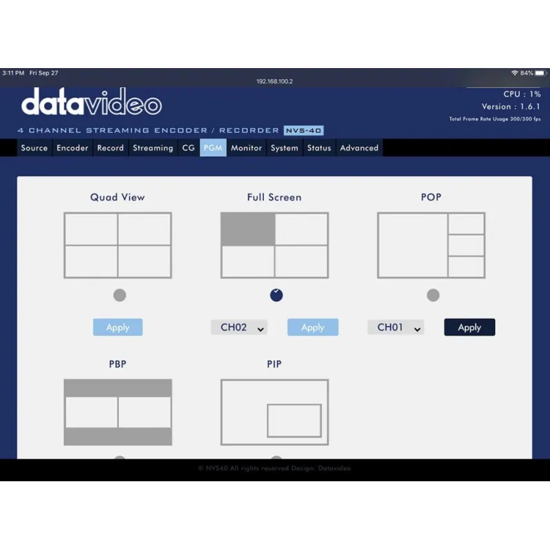 Supports live video streaming and IP video switching, also Quad View, Full Screen, PIP, PBP, POP mode for monitoring