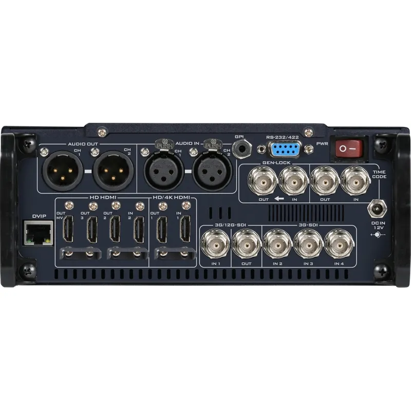 Supports one 4K HDMI input, one 12G SDI input and three 3G-SDI input as well as video outputs with embedded audio.