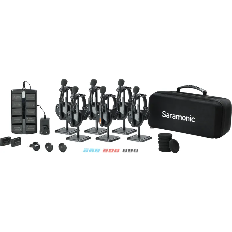 This configuration includes one main headset, five remote headsets, 12 rechargeable batteries, and a 10-slot charging station. It allows communication across all wireless headsets up to 500 m in line of sight, suitable for various broadcasting and event applications.
