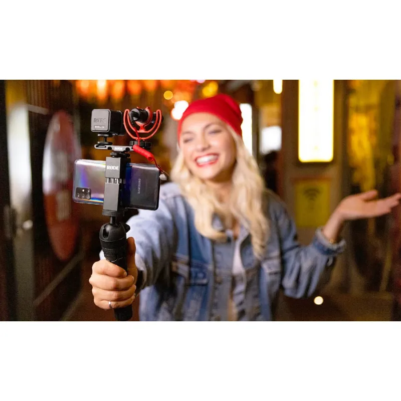 The Rode vlogger kit Universal 3.5 mm kit includes everything you need for a professional result when shooting with your smart device. The VideoMicro microphone connects directly to your smart device, providing crisp and clear sound for any application. The VideoMicro microphone is compatible with all 3.5 mm smart devices. In addition, the device can also be used with smartphones with a USB-C or Lightning socket using a special adapter. The SmartGrip holder secures your device in place and connects seamlessly to a tripod that you can use both in your hand and on the table. The MicroLED light ensures that all your shots are perfectly lit. The set also includes a DCS-1 dual cold shoe mount and Rycote Lyre suspension mount for quick and easy mounting of both the microphone and video light. In addition, a diffuser with a clip, 8 color filters, USB-C, and a 3.5 mm TRS-TRRS cable are included.