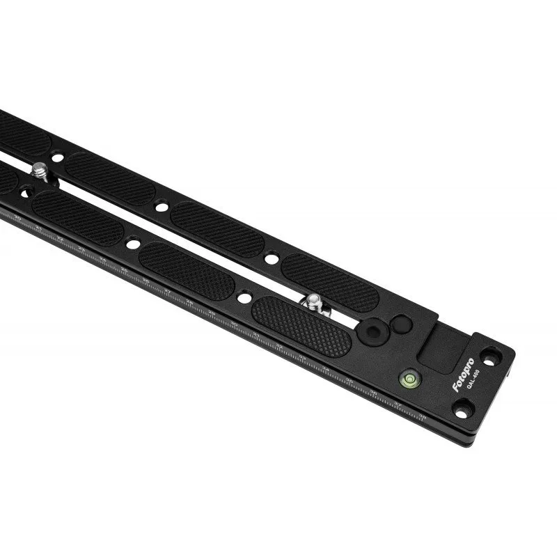 The Fotopro QAL-400 is an extra-long quick-mount plate, compatible with the Arca-Swiss standard. It will be an ideal choice for those who use telephoto lenses or want to create a portable and extended camera or camcorder workstation. The plate features 8 mounting points with 1/4″ female threads, 4.5 mm and 7.5 mm diameter holes, as well as a cold shoe mount. There are also rubber facings to improve grip, a spirit level and laser-engraved graduations (1 – 38 cm). You will also find 3 1/4″ mounting screws included.