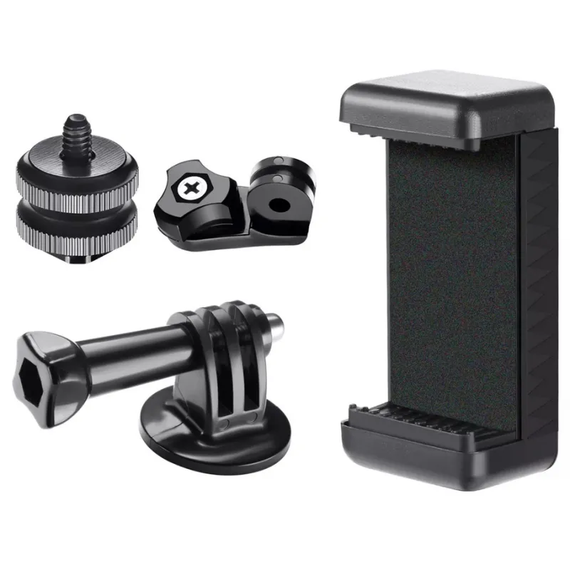Universalus telefono laikiklis ir veiksmų kameros adapteris, suderinamas su įvairiais modeliais.
