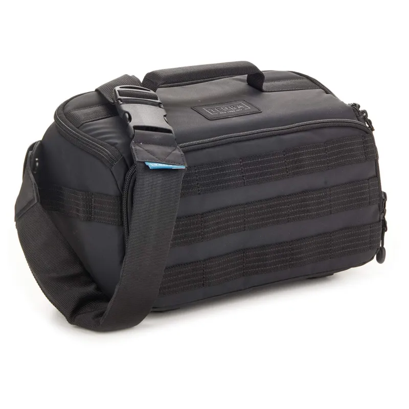 The black AXIS V2 Sling Bag from Tenba has a 6L capacity to protect and transport a camera plus four lenses up to 70-200mm f/2.8 or a DJI Mavic drone kit.. Expandable MOLLE webbing on the exterior is compatible with Tenba Tools Battery Pouches and Memory card wallets. This webbing can also accommodate various military-standard pouches and accessories. The shoulder strap has soft, body-contouring memory foam to keep you comfortable even when you're carrying heavy loads for long periods. The bottom of the bag has straps for carrying a tripod or a monopod. A hidden pocket holds a user-supplied Apple AirTag or Tile Bluetooth Tracker so you can locate your sling if it gets lost.