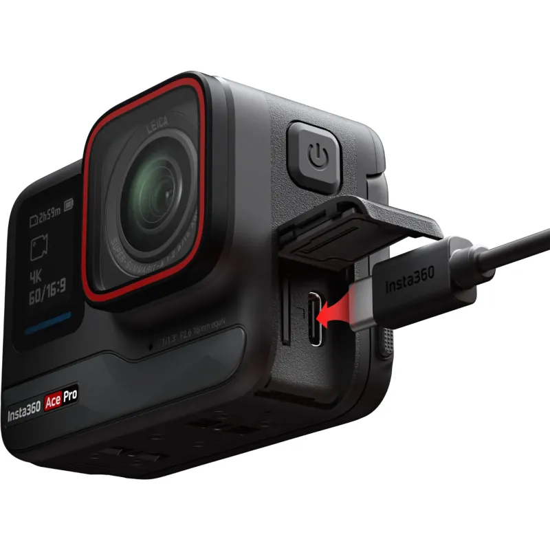 Derinkite su Insta360 Ace Pro greitam įkrovimui; įkraunama iki 100 procentų per 46 minutes ir iki 80 procentų vos per 22 minutes. Naudojant su Insta360 Ace, šiuo metu nepalaiko Type-C jungčių su Android telefonais.