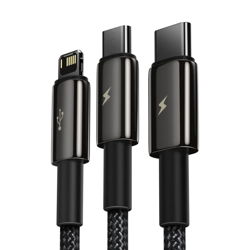 The cable is equipped with 3 different connectors, so it stands out for its wide compatibility and allows you to charge up to 3 devices simultaneously. The lightning connector fits iPhones. It also allows you to transfer files. The USB-C connector allows you to charge Xiaomi, Samsung, Huawei and other smartphones. Micro USB, on the other hand, is compatible with older Android phones and small home appliances.