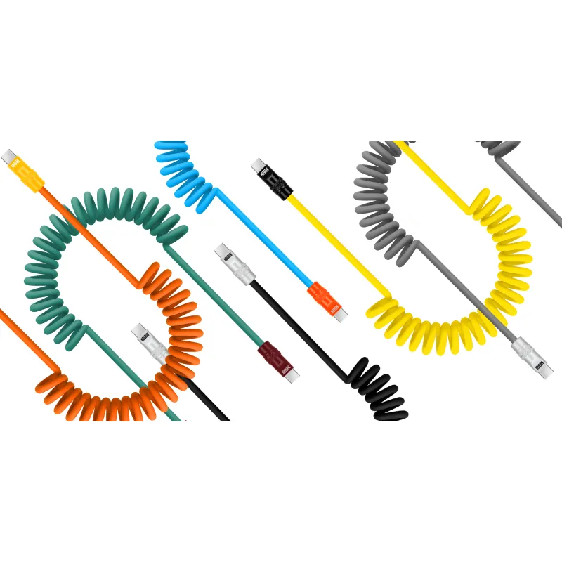 - Spiralinis silikono USB-C į USB-C laidas, skirtas įrenginių įkrovimui su iki 100 vatų galia