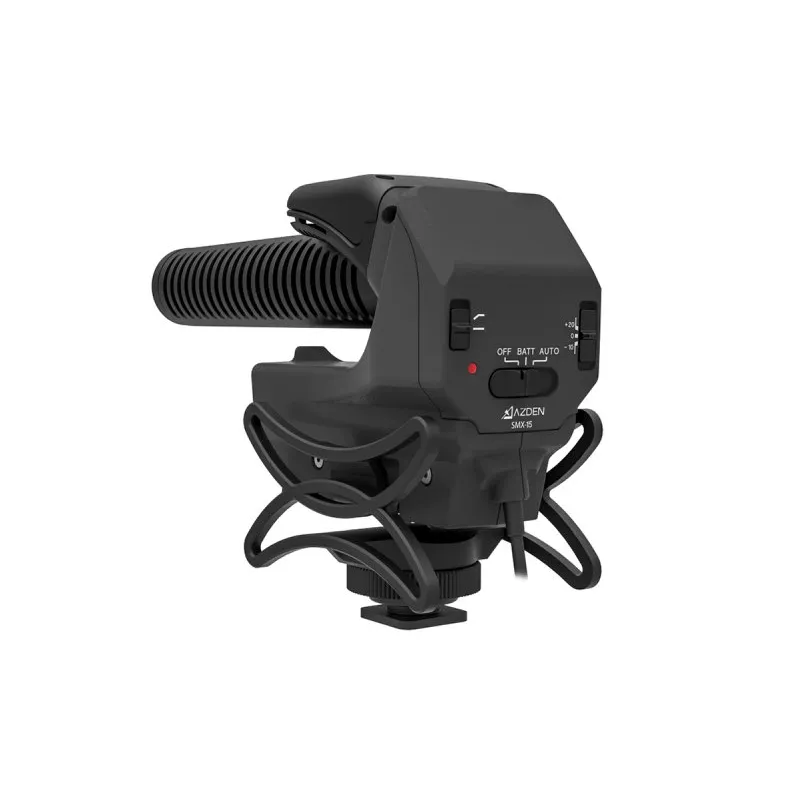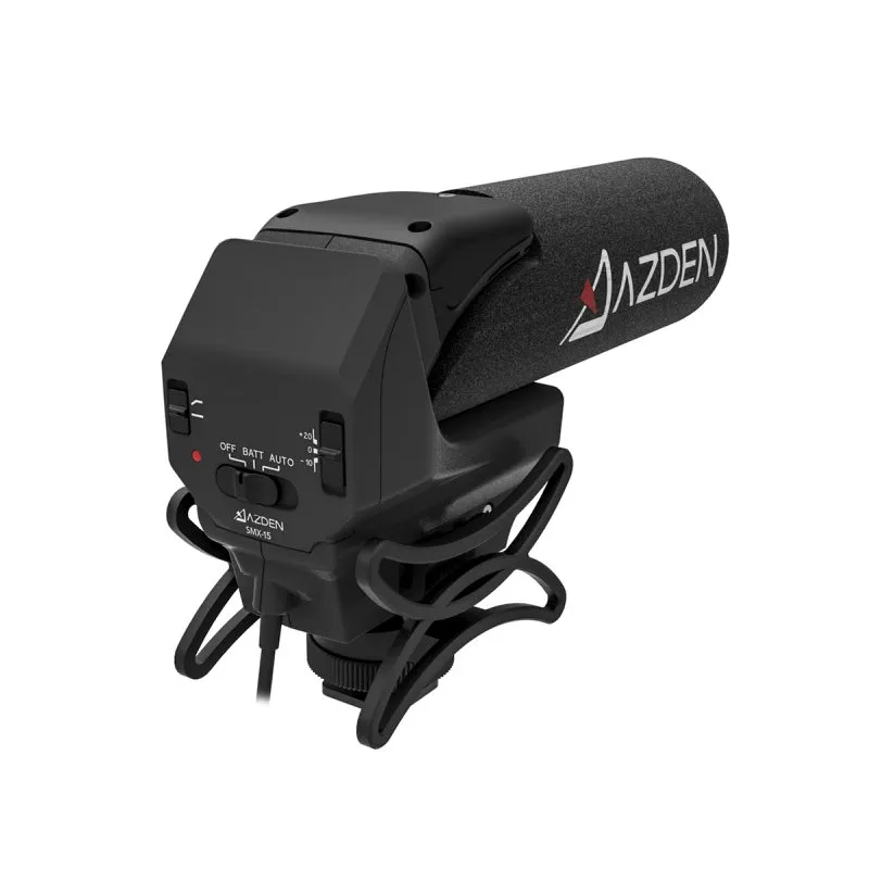 The SMX-15 Powered Shotgun Video Microphone was engineered to produce excellent sound quality for video recorded by DSLR and other compact cameras. The microphone element is the same used by Azden’s professional shotgun microphones, the SGM-250 an SGM-250P, and is capable of capturing broadcast quality sound. The acoustically tuned slots of the shotgun barrel give the SMX-15 it’s super-cardioid polar pattern which allows you to focus on sound in front of the camera, while reducing capture of extraneous noise from the rest of the environment.