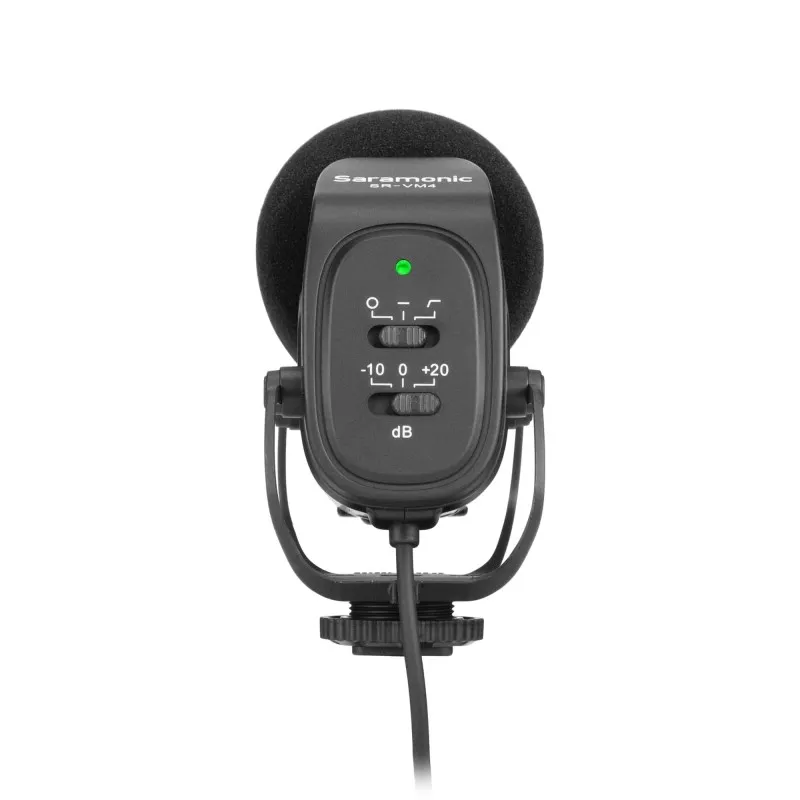 The Saramonic SR-VM4 is a high quality condenser microphone with super-cardioid characteristics for cameras and cameras with an integrated 3.5 mm TRS mini Jack microphone connector. It has a signal power adjustment, high pass filter and high frequency boost for best sound quality.