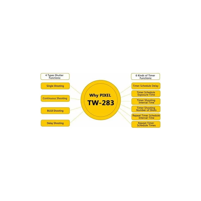 This multifunctional set supports five different modes. For example, you can remotely control your camera for a single photo (single shooting) or take a series of photos within 1 second (continuous shooting). In addition, the TW-283/S2 offers the BULB-shooting option, in which you determine the shutter speed. If your camera supports long shutter speed photography, you have the option to hold down the button on the remote control so that the shutter opens. When you release the button, the shutter will close again. You can also set a timer. In this mode (Delay shooting) you can set the timer between 1 and 59 seconds, where you can also determine the number of photos (1 to 59 photos). Finally, you can set up a Timer schedule shooting, up to a maximum of 99 hours, 59 minutes and 59 seconds. You can also freely set the number of photos to be taken between 1-99, 1-999 or infinity.
