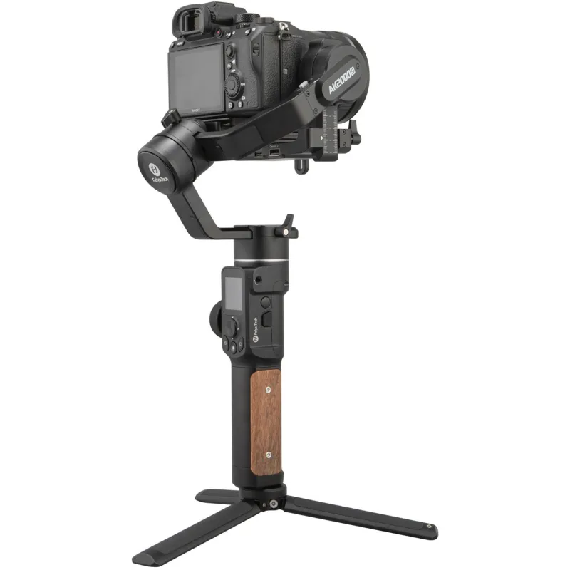 Technical precision The AK2000S model uses the most advanced manufacturer's solutions. Three 16.8 volt brushless motors provide the necessary power and a lifting capacity of 2.2 kg. The advanced W6 algorithm guarantees Swiss precision with a margin of error below 0.05°. The modern 200 MHz Cortex M4 processor controls the entire process, making 20,000 calculations per second. Faster processor also means greater responsiveness of the device. Now only 2 seconds from switching on is enough for the gimbal to be ready for operation. A large battery built into the handle provides energy up to 14 hours of stability. Practical design The well-thought-out construction and materials used allowed to keep the small dimensions of the device. The folded gimbal is not bigger than a sheet of A4 paper, thanks to which it will fit into practically every bag or backpack. Lightweight aluminum alloys allowed to reduce the weight to only 1.2 kg, which translates into greater comfort during work and transport. Minimalist design and black anodized elements give the gimbal a professional, unobtrusive look. The whole is completed by an elegant handle finished with polished rosewood inserts. Ergonomics of work The lightweight construction of the AK2000S can be extended with additional accessories as required. Four 1/4" tripod mountings allow the installation of an additional camera, lamp or monitor bracket. They can also be used to mount a cross mount included in the kit. This design allows you to work more conveniently when shooting a movie from a lower perspective. 1/4" and 3/8" mountings placed at the base of the gimbal allow to mount any tripod, monopod or plate. Axle lock and new mounting system To further simplify the daily use of gimbal and travelling, all axles are equipped with special traffic locks. They allow you to find the centre of gravity of the mounted camera in a flash and secure the device during transport. The new mounting platform enables quick installation of tiles in the popular Arca-Swiss standard, thanks to which the camera can be easily moved from gimbal to a tripod or monopod. Modes and functions The Gimbal FeiyuTech AK2000S offers five different stabilization modes that allow you to adjust the performance characteristics to your current needs. - Panning mode - in this mode, the camera follows the panning motion of the bracket smoothly while maintaining a constant position in relation to the horizon line. - Lock mode - the camera lens keeps a constant direction - panning on all axes is locked in a preset position. - Tracking mode - in this mode, the camera follows the pan/tilt movement of the mount and up/down direction smoothly. - Multi-axis tracking mode - in this mode, the camera lens follows the movement of the gimbal bracket smoothly in all three axes. - Quick Reaction Mode - the camera follows the movement of the mount's pan while maintaining a constant position relative to the horizon. In addition to the modes, the device gives us numerous functions such as: - Manual position setting - grab the camera to quickly set it in the desired direction. - Autopanorama - set the camera movement between two points to create breathtaking timelaps. - 360° Pan - let the camera rotate around the axis of the lens and capture familiar cinematic effects from Christopher Nolan's Inception. - Selfie - point the lens in your direction to record a vlogue or make a memorable selfie. - Vertical and Horizontal Arrangement - change camera orientation to create portrait or classic films. Simple and precise operation Controlling the device is extremely simple and intuitive. Switching between operating modes and functions is done with dedicated buttons. Their ergonomic arrangement on the gimbal's handle under the index finger and thumb ensures quick access at any time. The four-way joystick and the multifunctional knob provide precise control over movements. The latter can also control the focus or zoom of the connected camera or follow focus movements. The combination of gimbal with the camera also allows you to control the shutter release and start/ stop movie recording from the stabilizer buttons. Convenient navigation through operating modes, numerous functions and settings is ensured by a clear, tactile display located just above the joystick. The display not only informs about the operating mode, battery charge status or connected devices, but also provides an alternative method of device control. Feiyu ON, WiFi and Bluetooth For users of smartphones with Android and iOS systems the manufacturer has prepared a special mobile application Feiyu ON. It allows you to remotely control the gimbal via Bluetooth protocol and adjust its parameters. After connecting the smartphone with the camera, using WiFi, we also gain remote control over the camera settings from the stabilizer (the list of compatible cameras is available on the manufacturer's website), which gives much more comfort during the recording of shots. Safe transportation The stiffened suitcase included in the set ensures convenient and safe transport of gimbal together with its accessories. It increases the comfort of gimbal's use and allows to maintain ergonomics and work order. Specification model: FeiyuTech AK2000S Standard Kit weight: 1100 g (without accessories) power supply: built-in battery (up to 14 hours on a single charge) Load capacity: up to 2200 g (when properly balanced) the range of rotation of the axles: Tilt: 230° Roll: 360° Mr.: 360° fixings: 4 1/4" female tripod mountings 1 1/4" female tripod mountings on the transversal mount 1 female tripod mountings 3/8" colour: black Compatibility mirrorless cameras small DSLRs Set contents Gimbal AK2000S Traverse handle Stand USB cable - USB-C USB cable - micro USB 2.0 USB cable - micro USB 3.0 USB-C cable - multi USB (Sony) USB-C cable - micro Jack (Panasonic) Hard-case