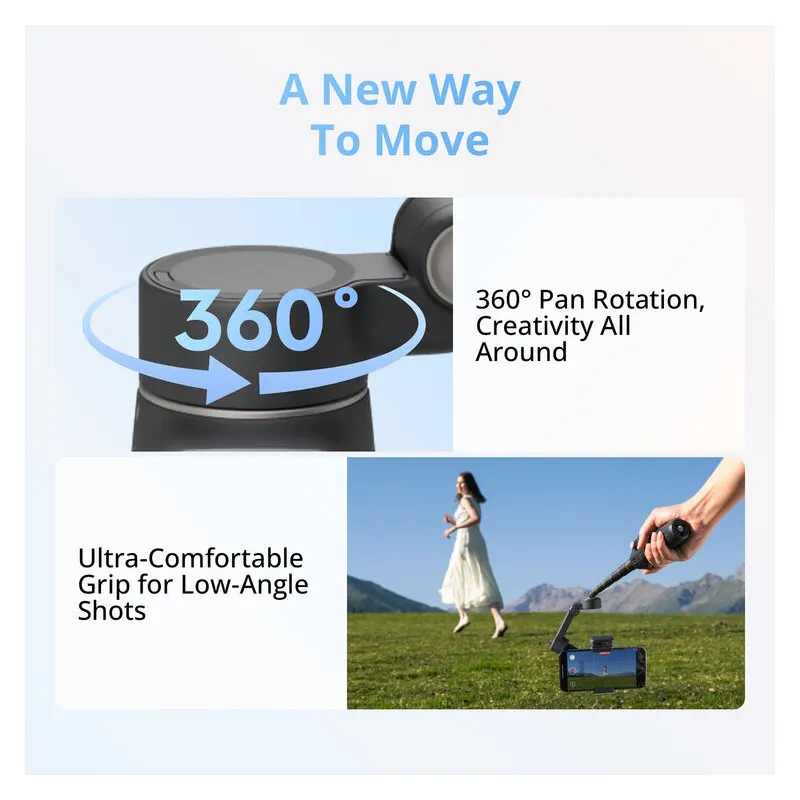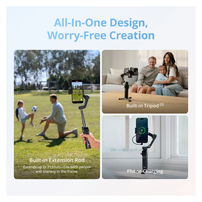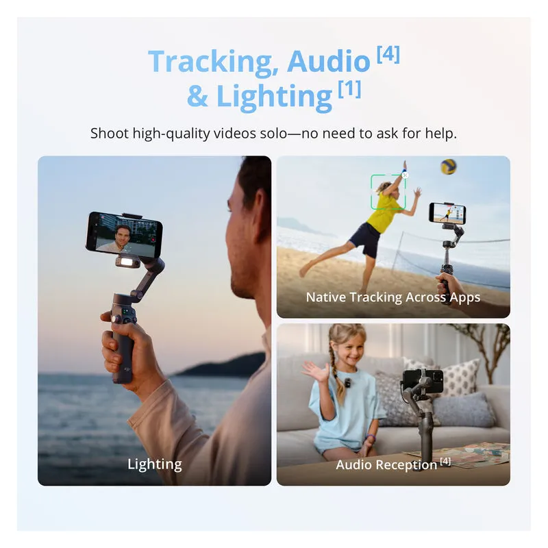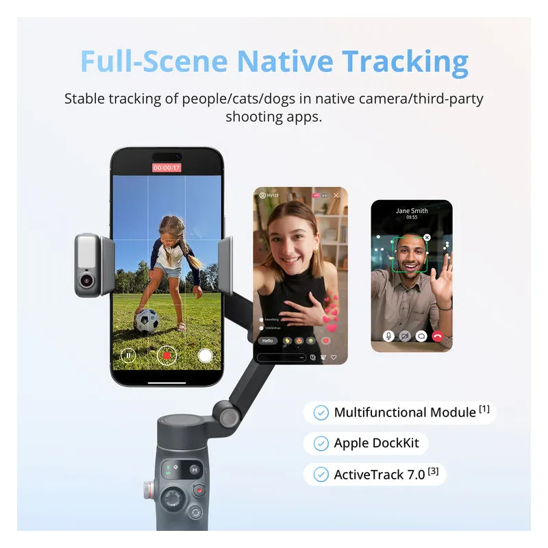 Tiksliai sekite objektus, išlaikydami stabilų išmaniojo telefono vaizdo įrašą su DJI Osmo Mobile 8 išmaniojo telefono gimbalu. Atliktas gimbalo stabilizatorius siūlo Multifunkcinį modulį ir ActiveTrack 7.0 technologiją. Jame yra magnetinis telefono laikiklis, palaikantis išmaniuosius telefonus iki 3.3