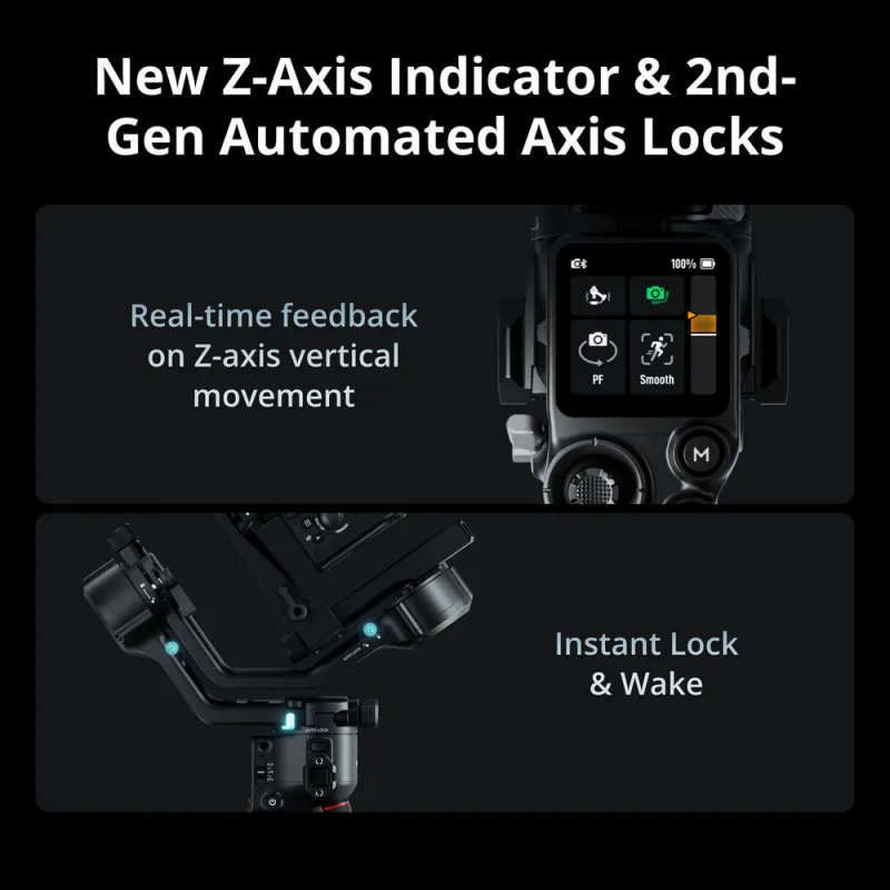 Naudokite RS 5 Gimbal Stabilizer, kad gautumėte dar sklandesnius vaizdo įrašus su Z ašies (vertikalaus) indikatoriumi. Šis galingas, tačiau lengvas gimbal užtikrina pilną įkrovą per vieną valandą, 15% ilgesnį veikimo laiką, Teflonu pagerintą balansavimą ir tikslumo reguliavimo rankenėles. Elektroninė valdymo rankena ir pažangūs AI kadro ir sekimo moduliai yra prieinami atskirai.