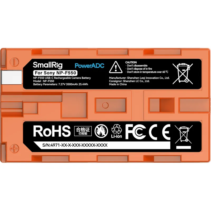 The SmallRig 4971 NP F550 USB C Rechargeable Camera Battery (Orange) comes with a USB C port to be charged via a power bank, power strip, car charger or dedicated charger. With a high charging current (5V 2.3A) and a rated capacity of 3500mAh, you can fill up the battery in 3 hours and keep equipment working longer.