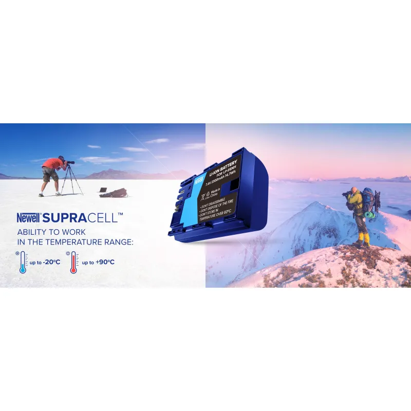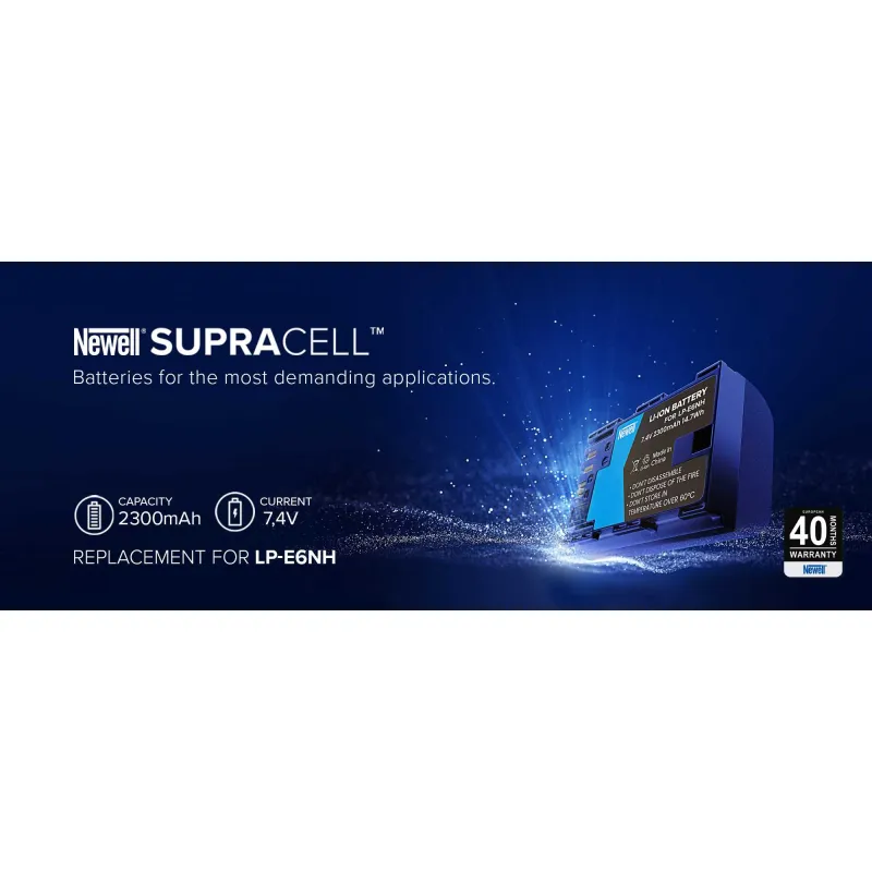 Newell SupraCell LP-E6NH is an innovative battery replacement designed for cameras. The cells and modern electronics used in it will satisfy even the most demanding users. The SupraCell line was created especially for intensive use, as well as very frequent charging and discharging. The presented cell offers up to 2300 mAh capacity. Thanks to the resistance to extreme temperatures, you will successfully use it while working on photos and films both in the winter landscape, and during hot days. With a 40-month warranty, the revolutionary Newell SupraCell battery will accompany you for many years, and in case of any failure will be quickly replaced by a new one by the manufacturer!