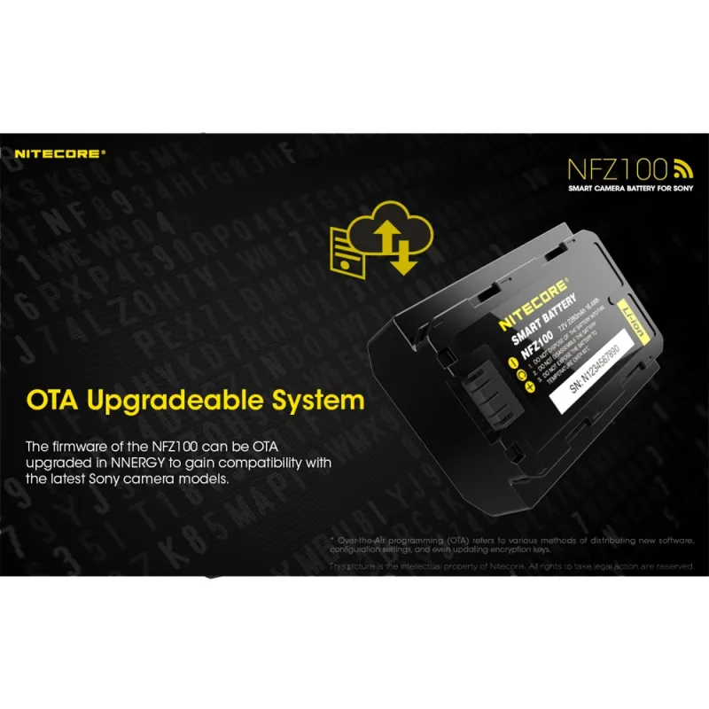 The battery's firmware can be upgraded OTA via the NNERGY app to ensure compatibility with the latest Sony cameras.