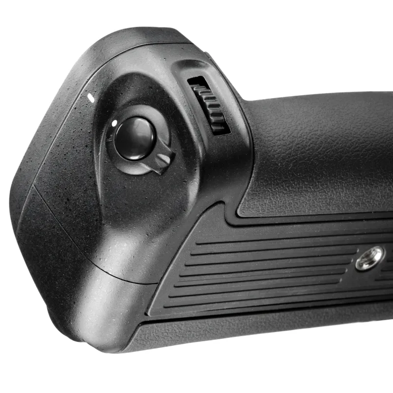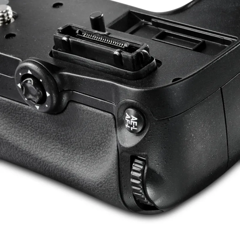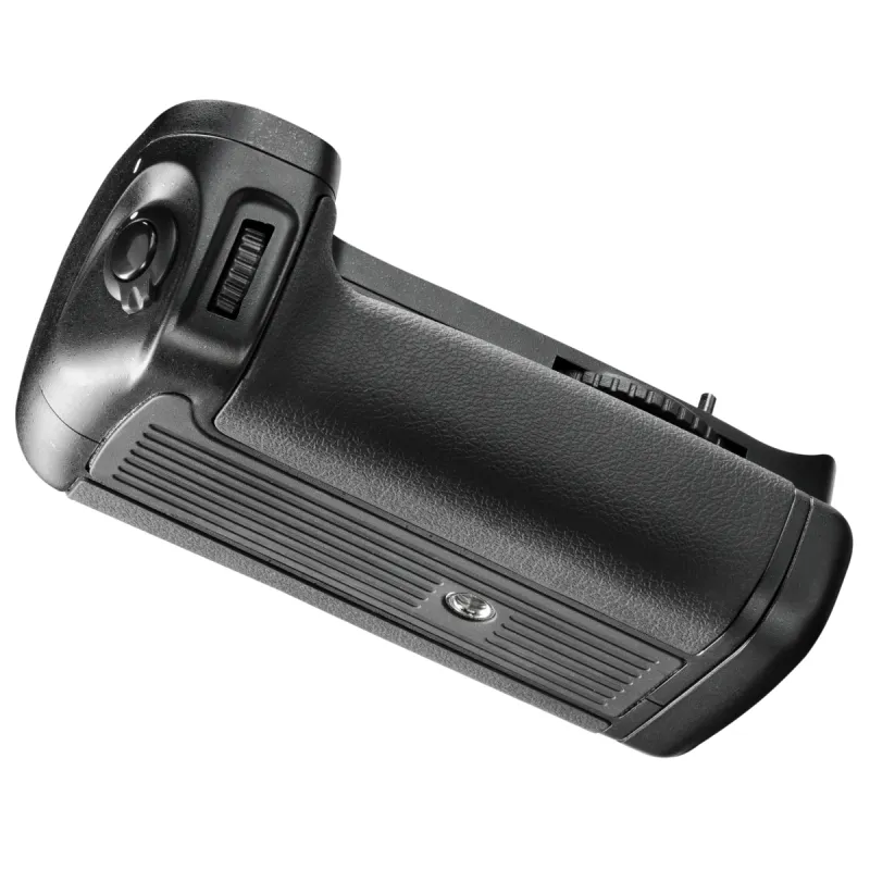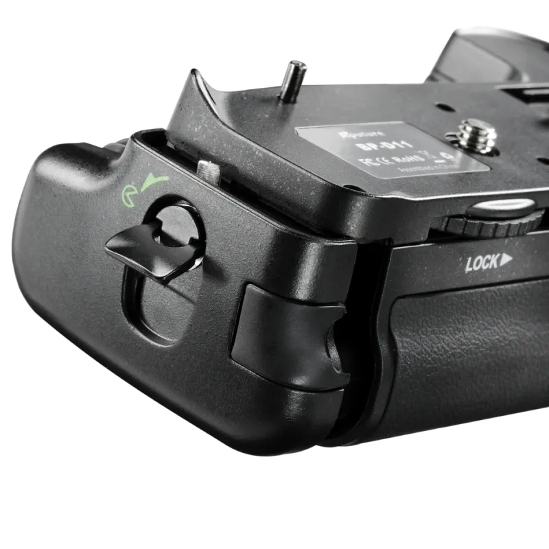 This high-quality battery grip by Aperture impresses with its fantastic workmanship and offers all function of the original MB-D11 by Nikon. Especially for photographing in the portrait format a secure grip of the camera is a deciding factor aside from the ease of use. For this reason the gripping surfaces are shaped ergonomically and equipped with a slip-proof rubber lining. Additionally, the grip also provides a secure mounting possibility for supporting loops. The battery compartment cover of the camera can be stored in the battery grip and is therefore securely protected from tearing off. The tripod thread is repeated on the bottom.