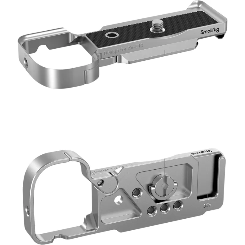 SmallRig Extension Grip for Sony ZV-E10 (Silver) 3524 is designed to enhance grip experience and provide accessory mounting points. The baseplate secures to the camera with a 1/4''-20 D-ring screw without tools. The bottom features an integrated Arca-type quick release plate that allows for mounting quickly onto a tripod. The bottom features multiple 1/4''-20 threaded holes which are compatible with DJI RS 2 & RSC 2 Quick Release Plate (Upper). The right side comes with a 1/4"-20 thread for mounting a tripod for vertical shooting and still maintains access to the flip screen and cable ports. Features a cold shoe on the bottom enables to mount a microphone or light, the distance from the Arca plate to the cold shoe is well tested so that you can mount an Arca tripod and wireless go at the same time. The battery door features an open-and-close lever and a pivoting structure for more durability and stability, which ensures a better grip experience without affecting battery replacement and overall fitness.