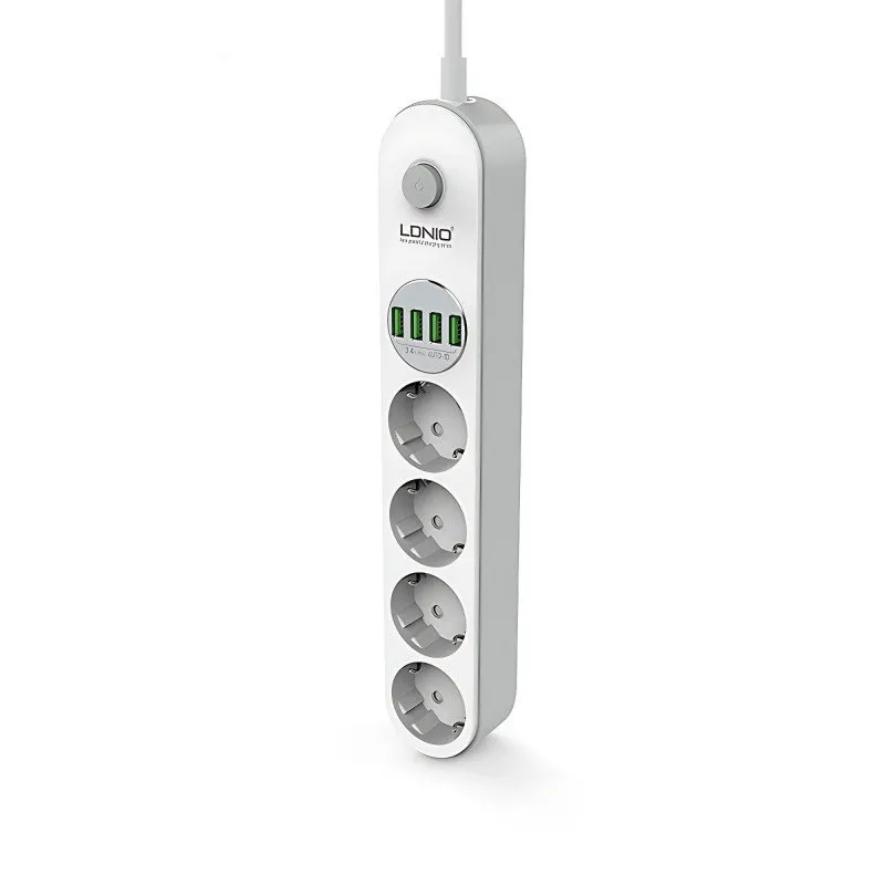 The Ldnio SE4432 is a modern power strip and USB charger in one. With four F-type AC mains sockets and four USB ports, you can power all your everyday electrical devices and charge the batteries in your smartphone, tablet or smartwatch. The power strip can operate between 100 volts and 250 volts, making it perfect for international travel. No matter what you plug into the extension cord, your equipment will be protected by the device’s intelligent systems.