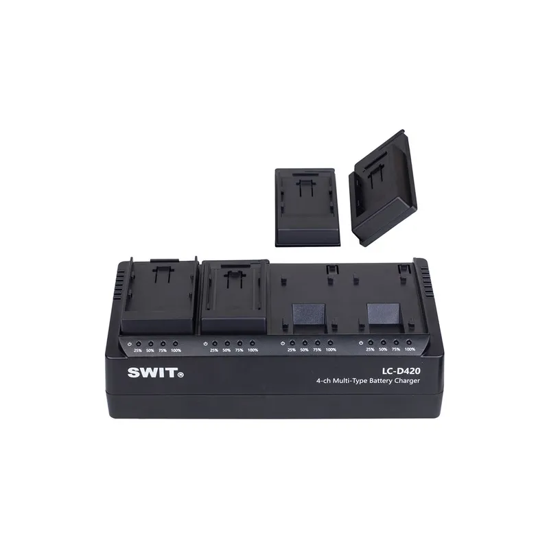 Charge up to four batteries simultaneously with the SWIT 4-Channel Simultaneous DV Battery Charger.