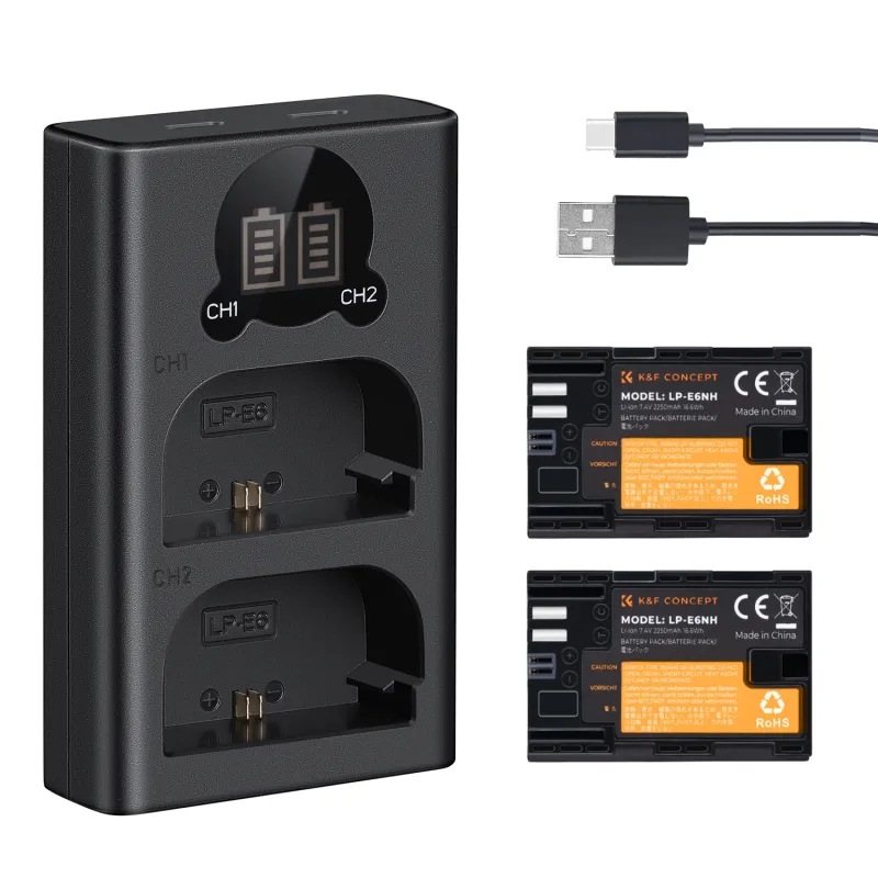 - Convenient. Charging kit includes 2 pieces of 7.4V 2250mAh Canon LP-E6NH replacement batteries and Micro USB/Type C dual interface charger, supports wall charger, car charger or mobile power charging. It is convenient to carry when you go out and record wonderful moments at any time without worrying about power failure. ''With a micro SD high-speed card with a super discount U3 C10, giving you a different experience"