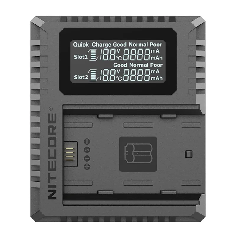 The Nitecore FX3 Charger is designed for simultaneously charging 2 Fujifilm NP-W235 batteries. The charger has a maximum output current of 1500mA in QC mode when charging one battery and a maximum of 600mA when simultaneously charging two batteries. In standard mode, the maximum output current is 1000mA when charging one battery. This charger is equipped with a handy and smart LCD display. It provides real-time information on battery status, voltage, charge current and battery temperature. The compact design makes it easy to take the charger with you. A USB Type-C cable is included to connect the charger to a USB power source. This battery charger can not only be powered by mains electricity, but also by an external source such as a powerbank, a QC 2.0 compatible USB charger for extra fast battery charging or a solar panel.