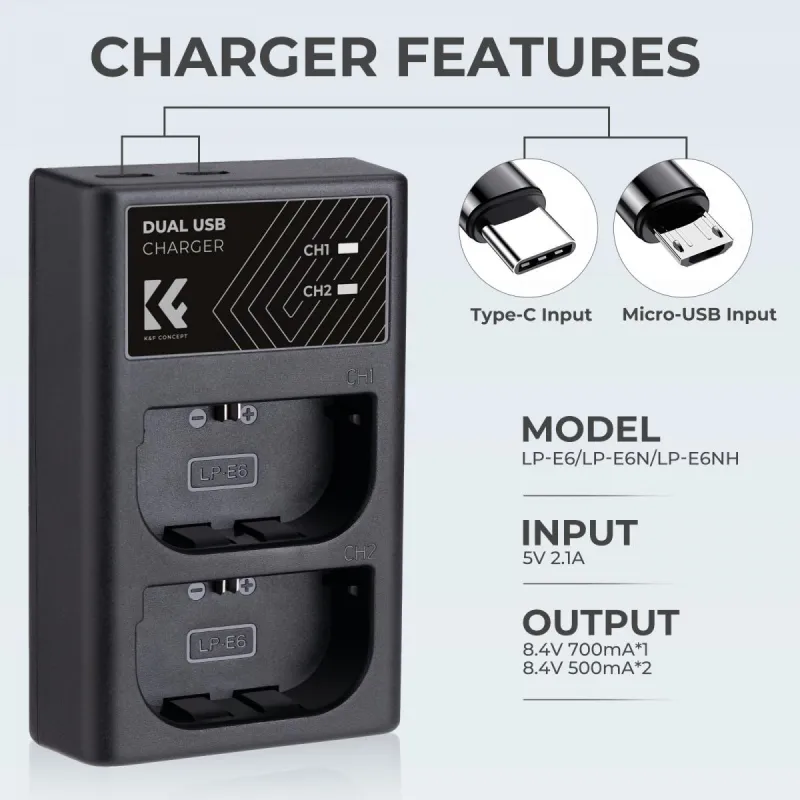K&F CONCEPT Nikon EN-EL15 Replacement Battery Charger Set. The charging set includes two 7.4V 2100mAh Nikon EN-EL15 replacement batteries and Micro USB/Type C dual port charger, which is easy to carry when going out and you don't need to worry about power failure when you want to record wonderful moments.