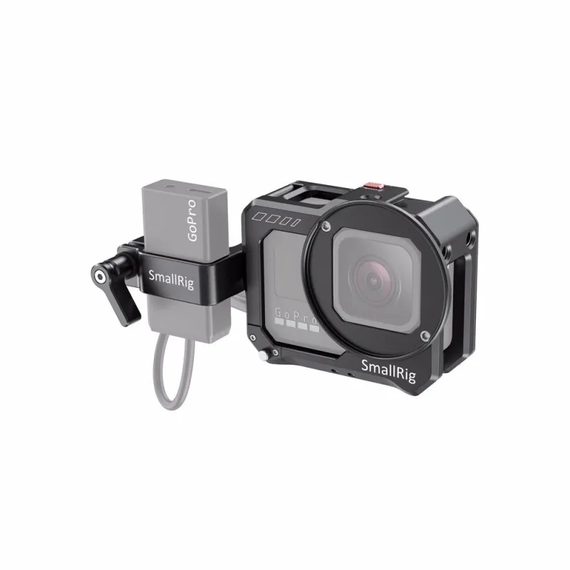 SmallRig Vlogging Cage and Mic Adapter Holder for GoPro HERO8 Black CVG2678 is a lightweight aluminum cage that protects the camera while providing a plenty of accessory mounts, without interfering with the camera's button, port and battery access. Slide the camera into the cage (take off the camera’s side battery door first), and simply press the cover to lock it in place.