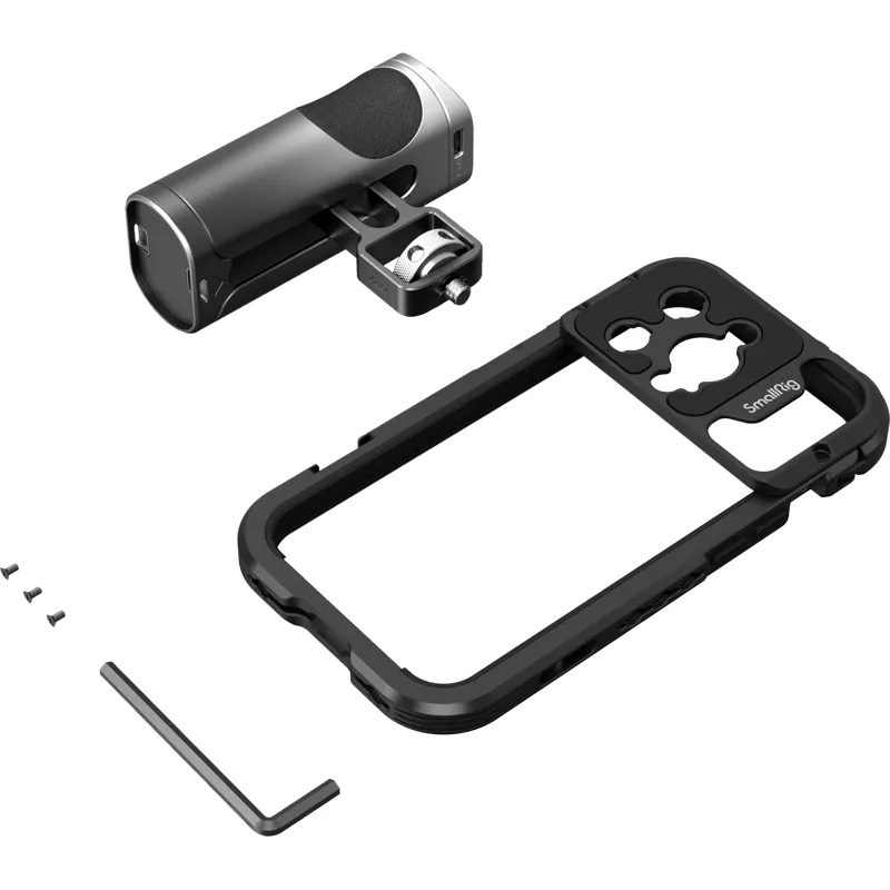 SmallRig Mobile Video Cage Kit (Single Handheld) for iPhone 14 Pro 4100 is a perfect mobile phone video rig for vlogging, mobile filmmaking, commercials, etc. The kit comes with a cage specially designed for iPhone 14 Pro and a wireless control side handle for a more stable and convenient phone shooting. The cage features 1/4"-20 anti-twist threaded holes and cold shoe mounts that support accessories as tripod, microphone, and LED light, etc. It supports M-mount or 17mm threaded lenses by replacing the backplane. It gives access to iPhone buttons, ports, radar, and ultra-wide angle lens thanks to its hollow design. The new structure increases the bare area of the back and is fully compatible with Apple's official wireless charging devices. The metal full cage with built-in pads prevents scratches, reduces vibration. The cage enables horizontal and vertical shooting.