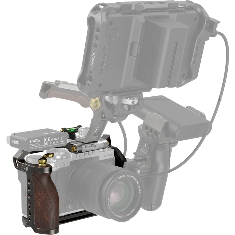 SmallRig Retro Cage for FUJIFILM X-T5 3870 is designed to protect the camera and provide accessory mounting points. The cage is endowed with a new punk style featuring a shutter button adapter frame and an ergonomic leather grip for improved shutter control and grip experience. It locks the camera via one 1/4"-20 screw at the bottom and two side lock adapters, with silicone pads preventing scratches. You will have full access to camera buttons, card slots, a flip screen, and a battery door.