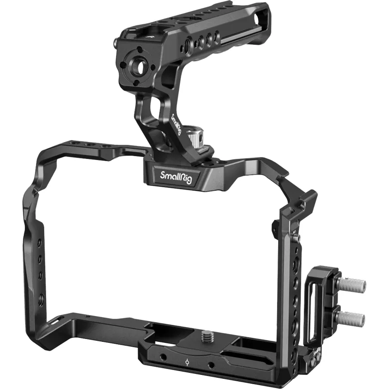 SmallRig Camera Cage Kit for Panasonic LUMIX GH6 3785 enables low-angle shot and protects camera, while providing a variety of accessory mounting points. The kit includes a cage, a HDMI & USB-C cable clamp and a top handle. The top handle feels comfortable and facilitates camera movement and low-angle shot. Like the cage, it features 1/4"-20 threaded holes for Monitor Mount 2294, a cold shoe for microphone, light, etc. and ARRI 3/8" -16 locating holes for Monitor Mount 2903. The cage has a built-in NATO rail on the left to connect NATO accessories, with a HDMI & USB-C cable clamp fixed to its left side via two M3 screws and tightened by a thumbscrew to prevent deflection and protect HDMI & USB-C interface, ensuring stable signal transmission. Built-in Arca-Swiss quick release plate allows tripod photography and supports extended quick release plate for DJI RS 2/RSC 2 gimbal. Besides, the cage comes with an accessible magnetic wrench for easy assembly and disassembly of accessories.