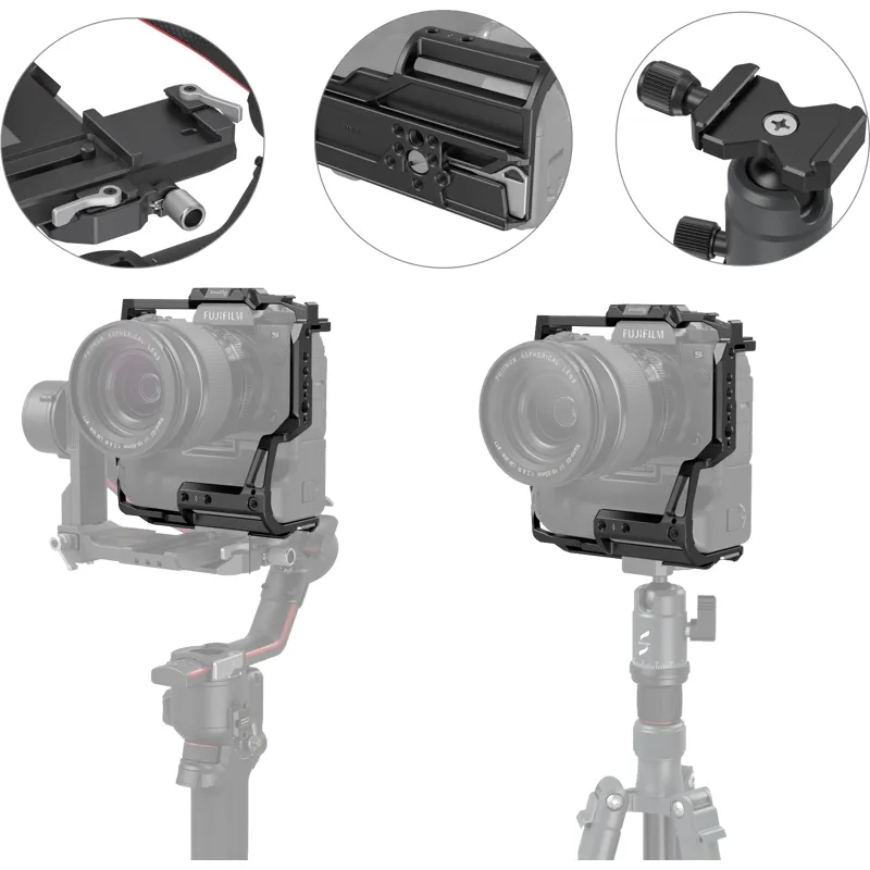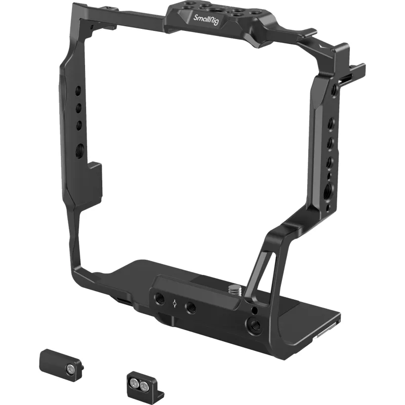SmallRig Multifunctional Cage for FUJIFILM X-H2S with FT-XH/VG-XH Battery Grip 3933 is designed to protect the camera and provide varied mounting points. It locks the camera via one 1/4''-20 screw at the bottom and two side lock adapters, also features several rubber cushions to prevent scratches. The cage gives full access to buttons, card slot, battery door, and flip screen. It comes with 1/4 "-20 and 3/8"-16 threaded holes for Top Handle 2165 & 1638, Side Handle 2093 & 2425, HDMI Cable Clamp 1693 for stable data transmission, Monitor Mount 2903 & 2904 for attaching monitor, Magic Arm 2115; two cold shoe mounts for microphones, LED lights, etc. Its bottom Arca-Swiss quick release plate supports Arca-Swiss tripod and DJI RS 2/RSC 2 for quick switch among handheld, stabilizer, and tripod shootings. On its front, there are two 1/4"-20 threaded holes that are compatible with 15mm RailBlock v3 942 for such accessories as Matte Box 3196 and Lens Support 2152; and one 1/4 "-20 locating hole that supports Single Rod Clamp 3276 for follow focus 3010. Besides, a built-in flat-head screwdriver is available to facilitate assembly and disassembly.