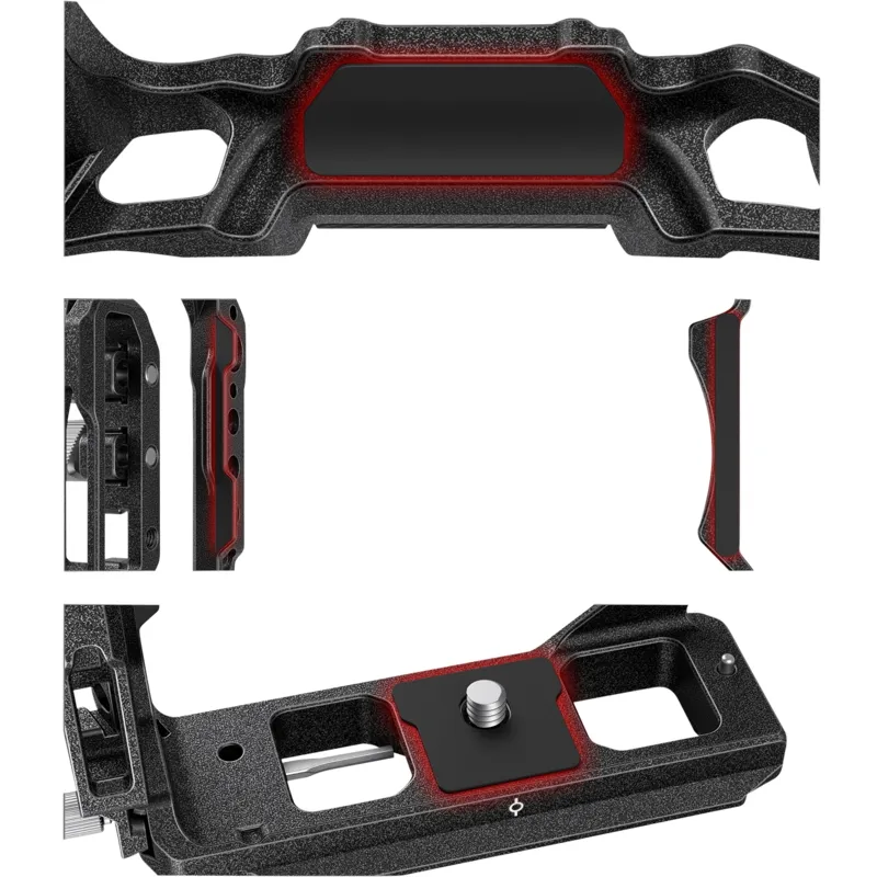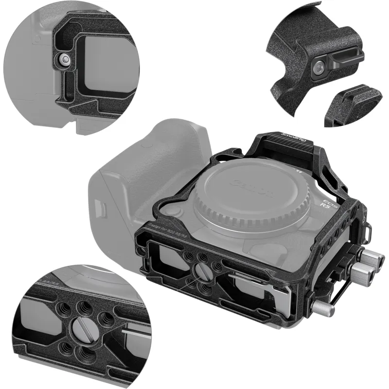 SmallRig “Black Mamba“ Half Cage & Cable Clamp for Canon EOS R5&R6 3656 is designed to leave the camera handgrip fully accessible and provide multiple accessory mounting points. The cage is locked with a 1/4" screw and a locating pin at the bottom and through the shoulder strap hole on the left side to prevent deflection. Silicone pads are built-in at several positions to protect the camera from scratches. The “Black Mamba” style is continued, maintaining full access to the camera's controls. the cage feature multiple 1/4"-20, ARRI 3/8" -16 locating holes, cold shoes mount to attach accessories like Side Handle 2093, Top Handle 1984, magic arm 2070, microphone, light, and hand strap PAC2456. Integrated Arca-Type base directly compatible with DJI RS 2 & RSC 2 Gimbal to realize quick switch among RS 2, tripod and handheld shooting, and Built-in spanner on the bottom helps remove screws. The attached hand-tight HDMI & USB-C cable clamp to prevent accidental disconnection and ensure stable signal;