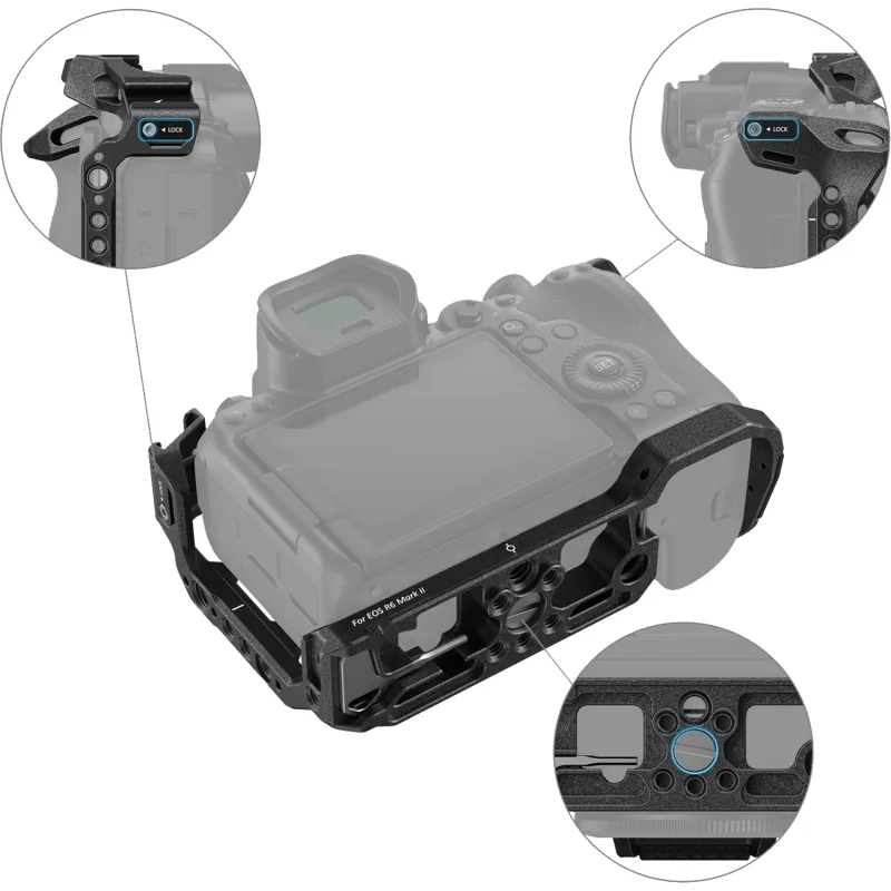 The SmallRig 4161 Black Mamba Camera Cage for Canon EOS R6 Mark II is designed to protect the camera and attach accessories. It locks the Canon EOS R6 Mark II via a 1/4 20 screw at the bottom and two locking adapters at the sides, with rubber pads that prevent scratches. Featuring a Black Mamba design, this cage offers full access to all camera buttons and multiple attachment options for accessories. These include ARRI 3/8 16 mounting holes for Top Handle 3765/2165C and Monitor Mount 2903B; 1/4 20 threaded holes for Side Handle 4016; the built in cold shoe attachment for microphone and LED video light; and shoulder and wrist strap holes for Hand Strap 3848 or Shoulder Strap PSC2428.