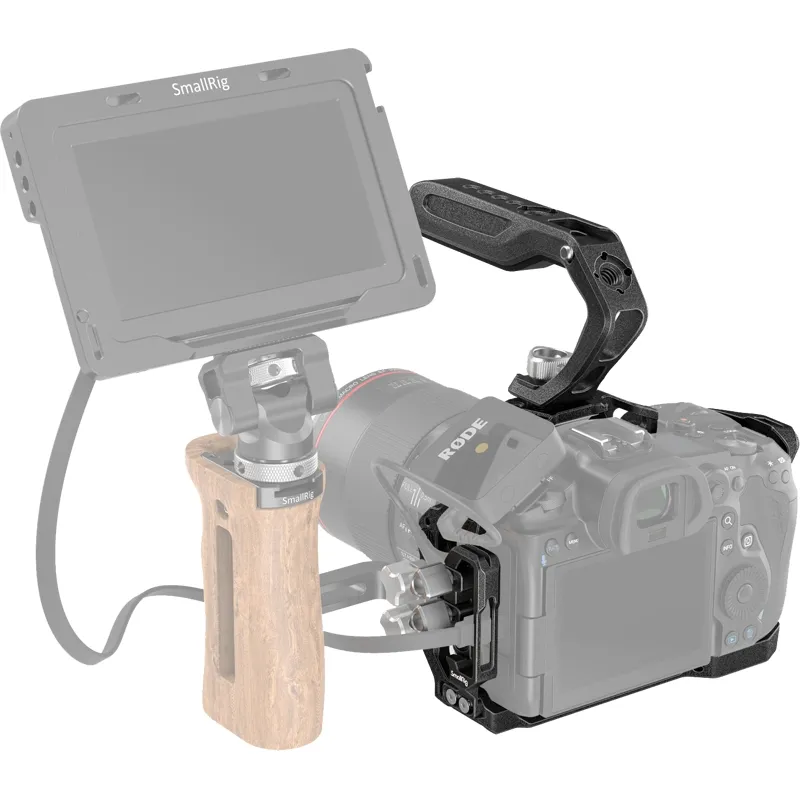 SmallRig “Black Mamba” Kit for EOS R5 & R6 3234 includes an ARRI top handle, a full cage and a dedicated cable clamp. The all-in-one cage provides protection and multiple accessory mounts for the camera. Its new design possesses clear outlines around the grip, maintaining full access to the camera's controls. The attached cable clamp locks the HDMI cable to prevent accidental disconnection and ensure stable signal; the lightweight ARRI top handle weighs only 122g and has an ergonomic design for a comfortable grip and a firm hold. Both the cage and the handle feature multiple 1/4"-20 & 3/8"-16 threaded holes to support accessories like magic arm and side handle. The kit weighs just 313g for the user to reduce arm load in shooting.