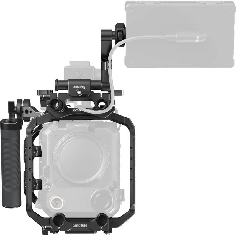The kit includes the camera cage, a top handle, and various mounting hardware.